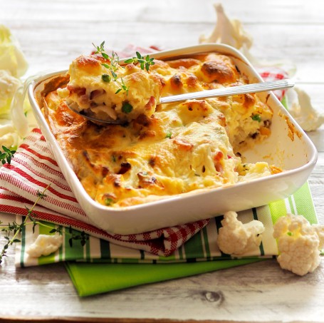 - Eine Auflaufform ausbuttern und ausbröseln, Karfiolröschen, Schinken, Erbsen und Bohnenkraut einfüllen, mit der Béchamelsauce übergießen und im auf 220 °C Heißluft vorgeheizten Backofen gute 20 Minuten goldbraun backen, warm servieren.